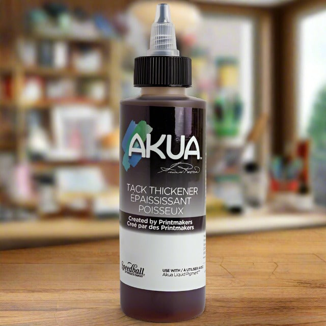 Tack Thickener thickens Akua Kolor for heavier roll-up applications. It can be used for creating denser Akua Kolor roll-ups onto monotype plates or woodblocks. It is not as thick as Transparent Base or Akua Intaglio Ink. It is amber in colour with a consistency similar to molasses. Tack Thickener cleans up in soapy water.