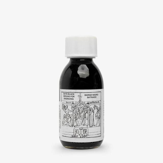 This is a superior liquid hard ground for etching. It is applied with a flat soft brush. After the plate has been smoked it presents a satin black surface which is easily drawn upon, responding to the most intricate and finely detailed needling with no risk of flaking or foul biting. The bottle is supplied complete with safety cap.