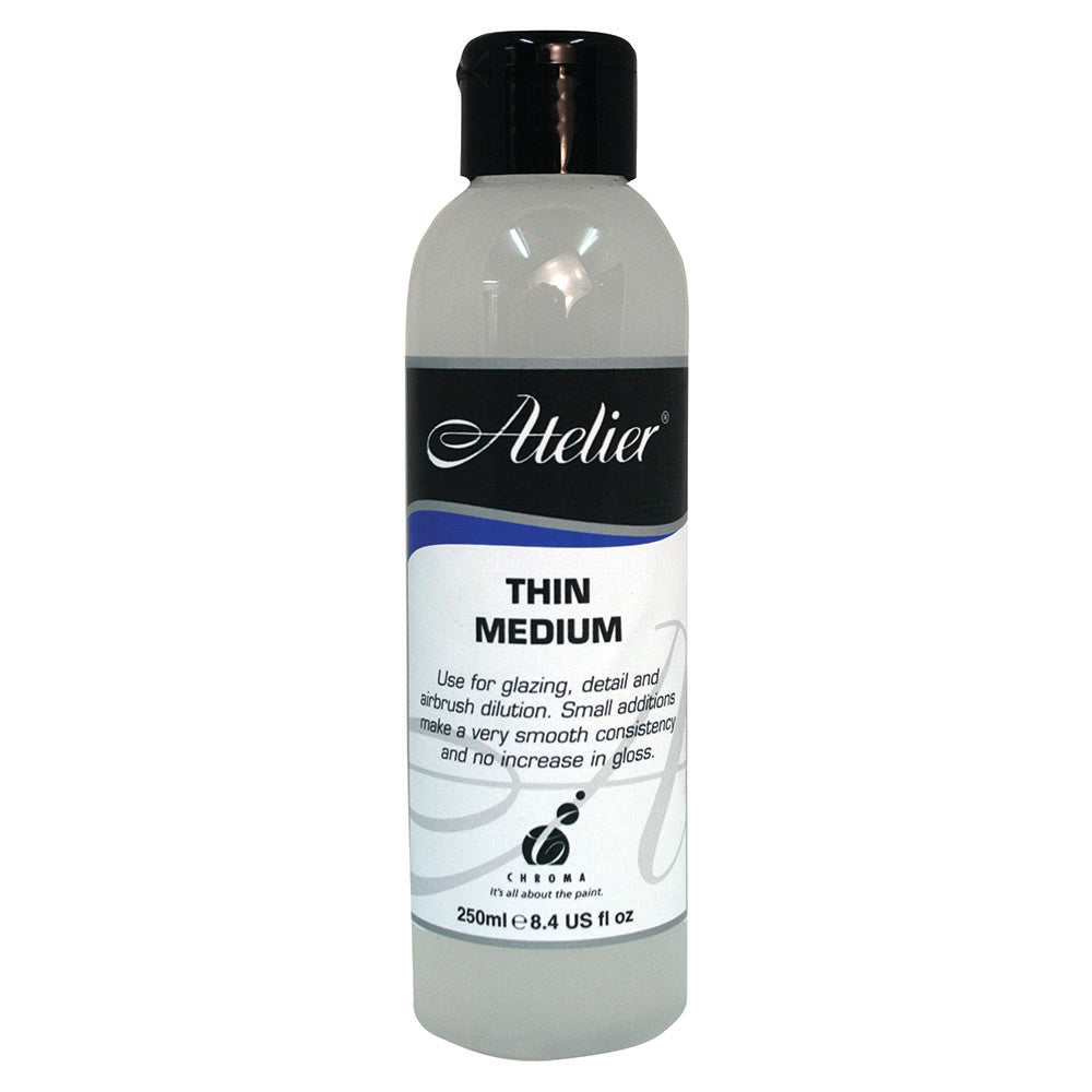 Atelier Thin Medium is a flow aide. Its very liquid viscosity is useful for thinning paint for techniques such as fine detail work, glazes, or air brush dilution.