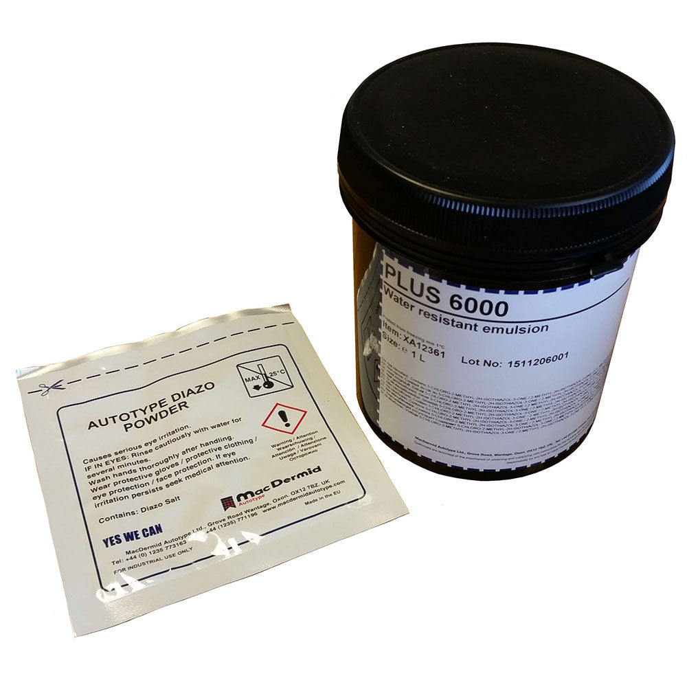 A high-quality emulsion supplied with diazo powder sensitiser. Handle Plus 6000 under yellow fluorescent tubes or low wattage tungsten light only. It is for use with water-based printing inks (Permaset/Permaprint) and it has outstanding durability, giving extremely fine resolution and definition with wide exposure latitudes.