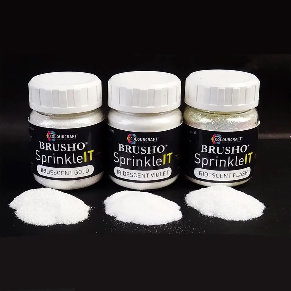 Add a new dimension to working with Brusho Crystal Colour using Brusho Sprinkle It. This is Brusho that sparkles and shimmers. Simply sprinkle it over Brusho Crystal Colour and spritz with water, it will create amazing effects. Ideal on canvas, card, gift tags, scrapbooking, mixed media projects, interior design and home decor. Use Brusho Sprinkle It on black card, spritz with water for stand-alone effects.