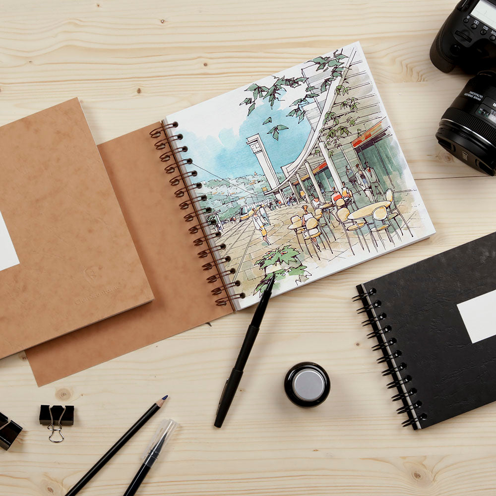 Sleek and sophisticated travel journals featuring a faux-leather cover and 20 sheets of Fontaine Torchon 300gsm watercolour paper. These books are bound in a spiral format and the pH neutral, acid-free, 100% cotton paper includes a die-cut window on the front cover.