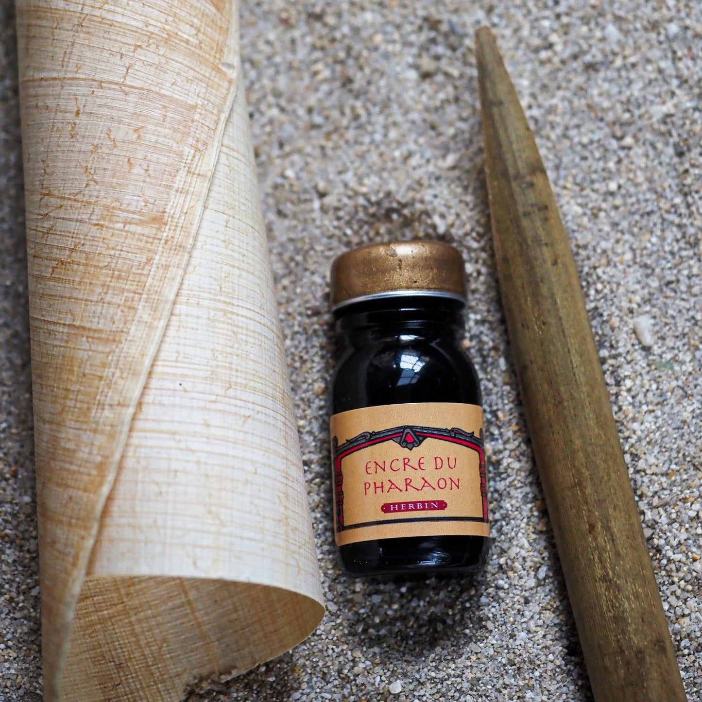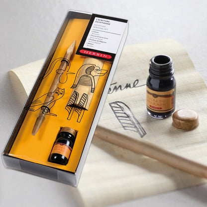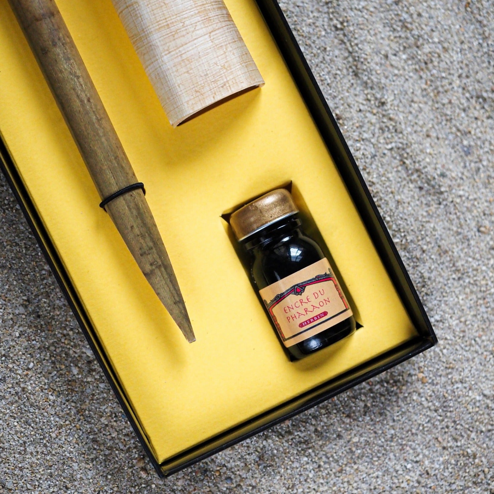 Egyptian writing set containing a reed pen, one sheet of papyrus, one 10ml bottle of Herbin Black ink and instruction booklet.