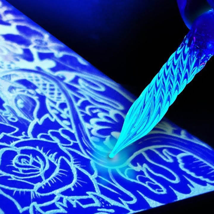 Also known as Luminescent ink, this dip pen ink dries to a translucent finish that is faint on dark paper and nearly invisible on light paper. The ink then glows to phosphorescent green when viewed in the dark or when exposed to UV light. This ink is perfect to hide special messages in calligraphy or the artwork.