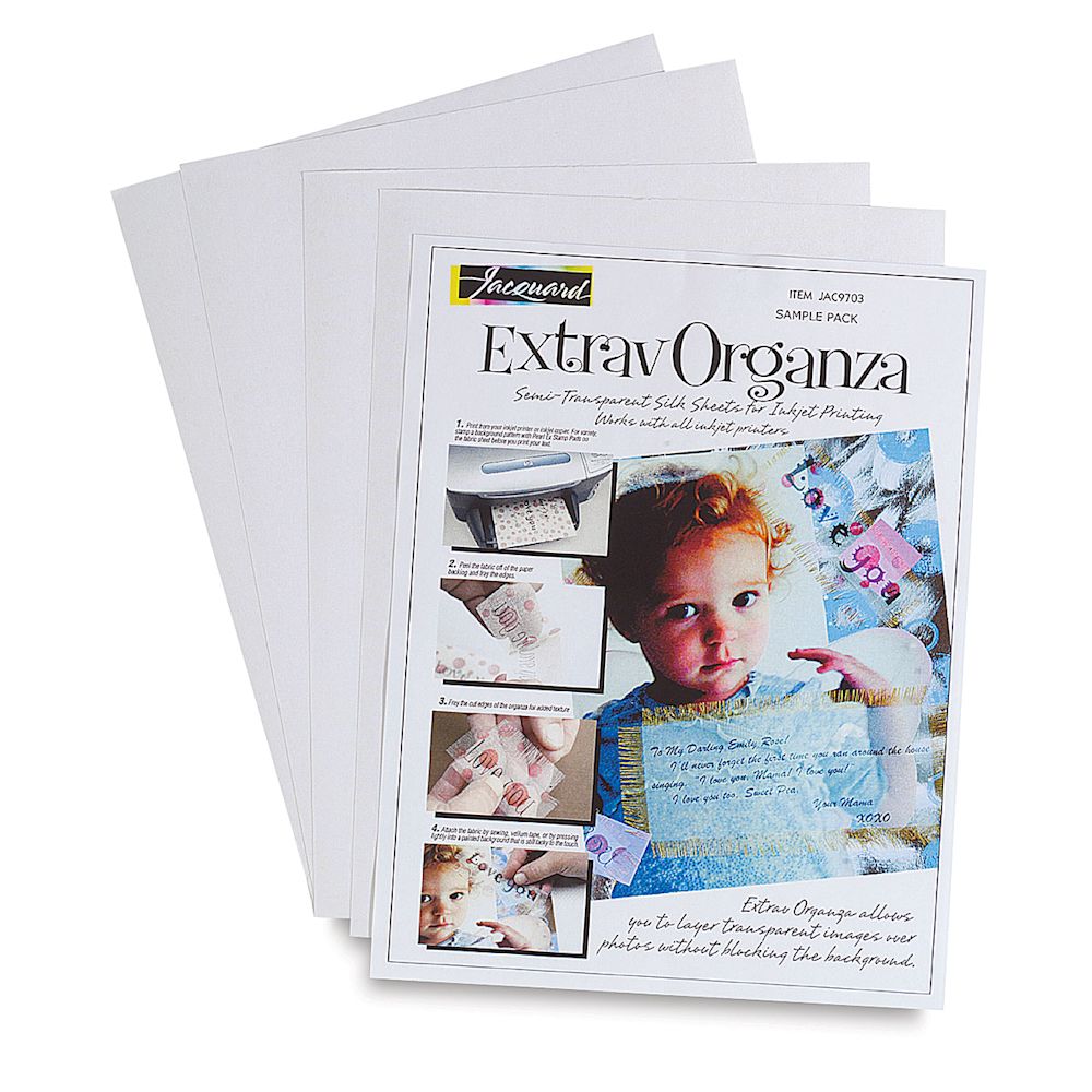 ExtravOrganza is a semi-transparent silk organza fabric sheet that is paper backed to run through an inkjet printer or inkjet copier. ExtravOrganza allows you to layer transparent images over the top of other artwork without blocking them.