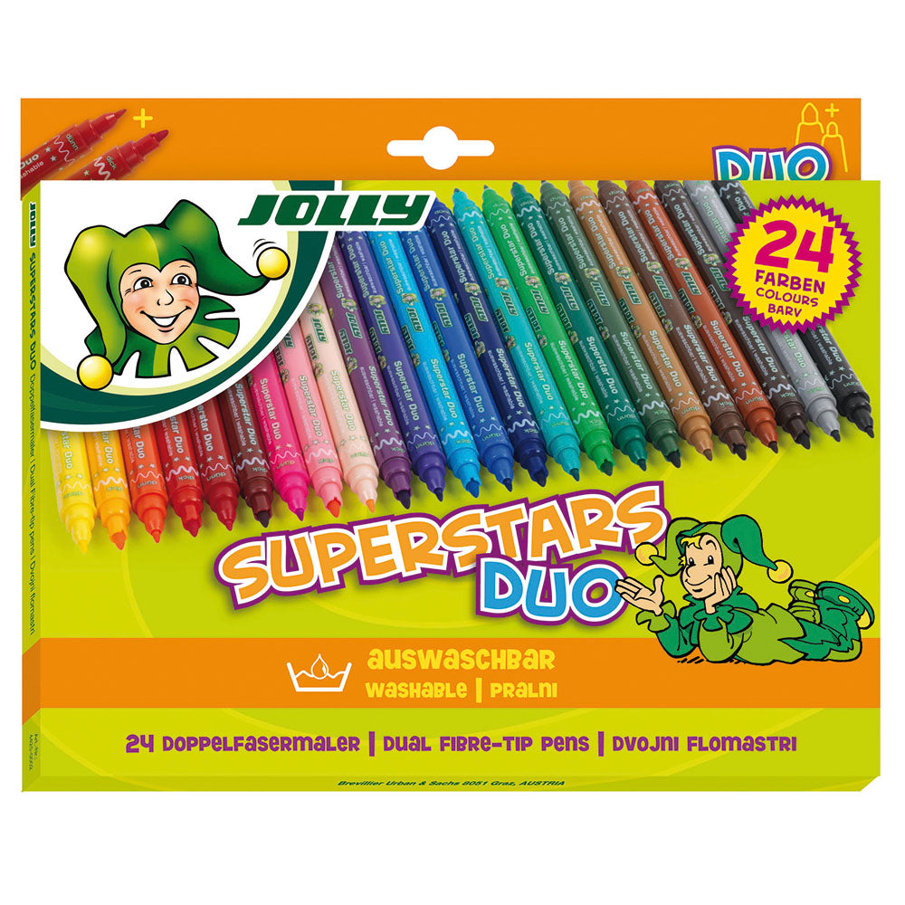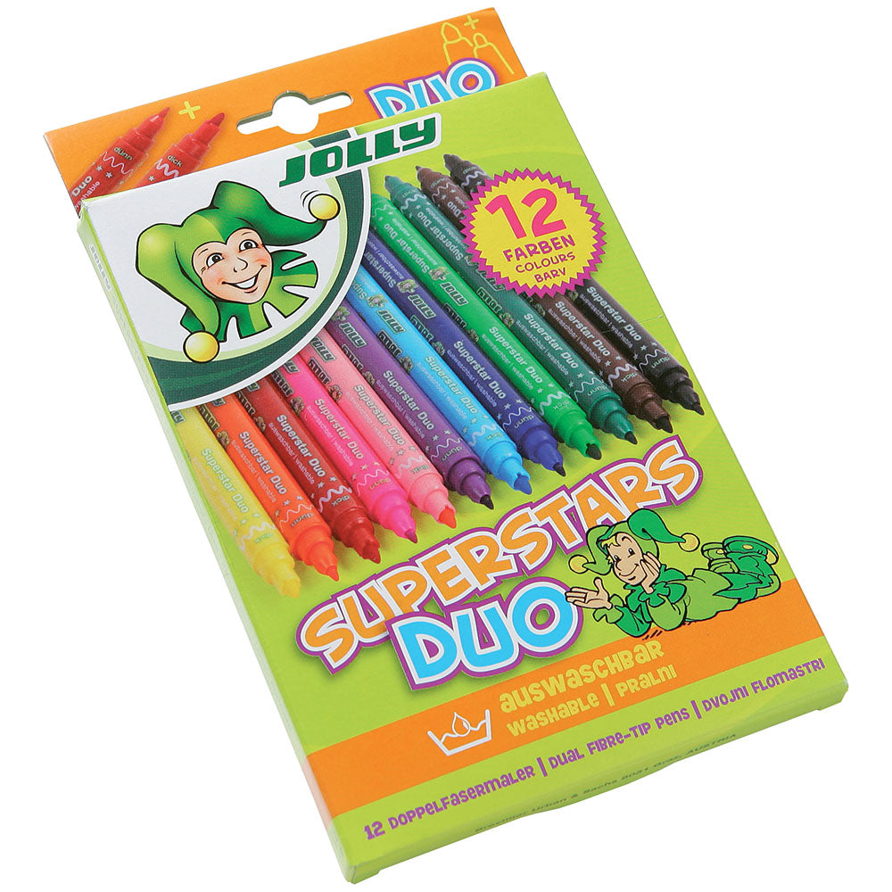 The Superstar Duo markers feature two tips for more drawing fun! The thick fibre tip is ideal for laying down large areas of colour. The thin tip is perfect for detail and outlines. Bright and strong colours. Non-toxic, washable ink and ventilated safety cap.