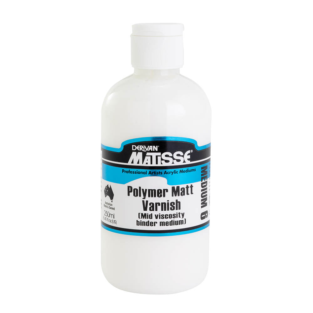 Matisse Polymer Matt Varnish can be used as a final varnish over a dried, well-cured acrylic painting when a flat, matt or very low sheen is required. Most suitable as a protective coating, particularly over significant works exposed to damage in public galleries, commercial paintings required for floodlit photographic reproduction and paintings that would be improved by eliminating unbalanced glossy highlights. Although white, Polymer Matt Vanish dries completely clear and is non-yellowing.