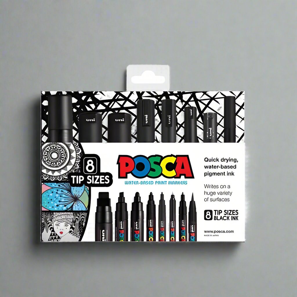 Master precision and bold contrast with the POSCA Black 8 Tip Set, a full-range collection of POSCA pens in jet black. Featuring all eight tip styles from ultra-fine to broad chisel and brush, this monochrome set is an essential for every creative toolbox.