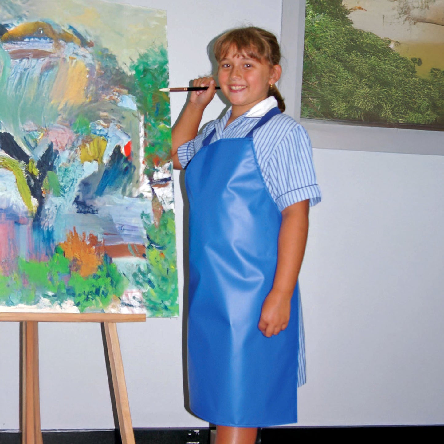 These robust aprons are made from reinforced, navy blue vinyl and feature durable textured polyester straps which are solidly stitched to the apron body. They are water resistant and fire retardant, never need washing. A quick sponge with a damp cloth keeps them looking new.