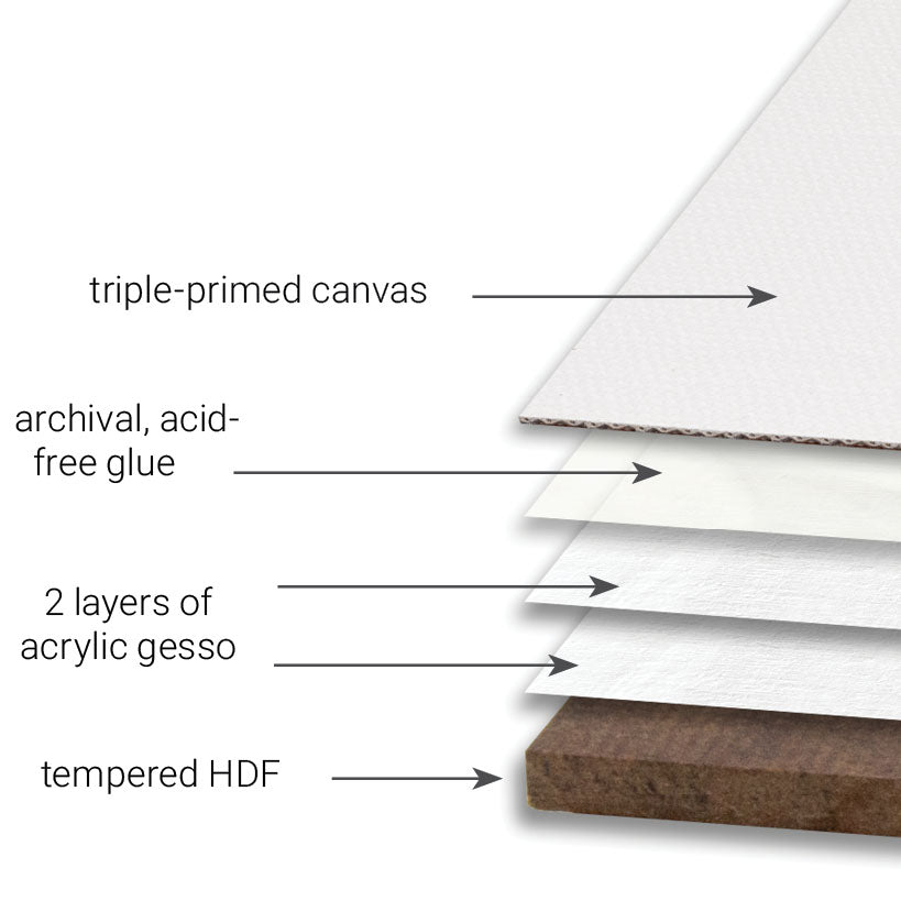 Richeson Cotton Canvas Hardboard Art Panels have a soft tooth finish, which makes them the perfect painting surface for oils, alkyds, acrylics, casein and other water-based paints. They are warp-resistant and moisture-resistant because they are mounted on high-density, tempered hardboard (masonite). The hardboard panels are first coated with two layers of high-quality acrylic gesso that acts as an archival barrier between the hardboard and canvas The triple-primed acrylic cotton canvas is then adhered to the already primed hardboard with an archival quality, acid-free glue.