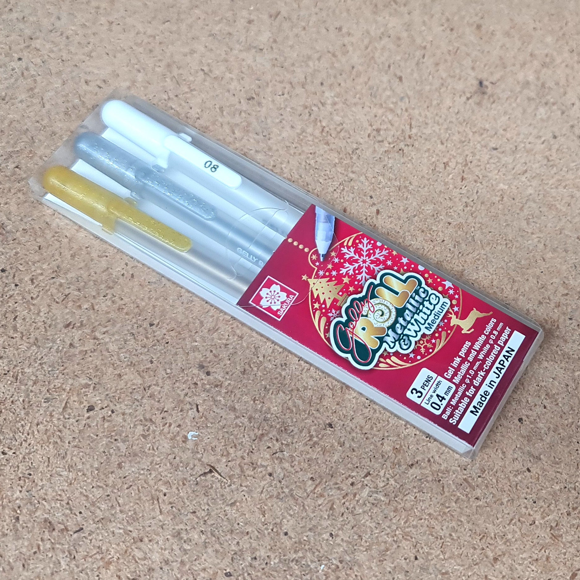 This wallet set of 3 Gelly Roll pens contains one each of Metallic Gold, Metalic Silver and White - ideal for Xmas decoration and cardmaking.