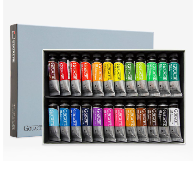 Contains one 15ml tube each of Alizarin Crimson, Carmine, Scarlet Red, Brilliant Orange, Permanent Yellow Orange, Permanent Yellow, Lemon Yellow, Olive Green, Leaf Green, Permanent Green Light, Emerald Green, Viridian, Aqua Blue, Turquoise Blue, Ultramarine Light, Prussian Blue, Violet, Rose Opera, Yellow Ochre, Burnt Sienna, Burnt Umber, Ivory Black and Permanent White.