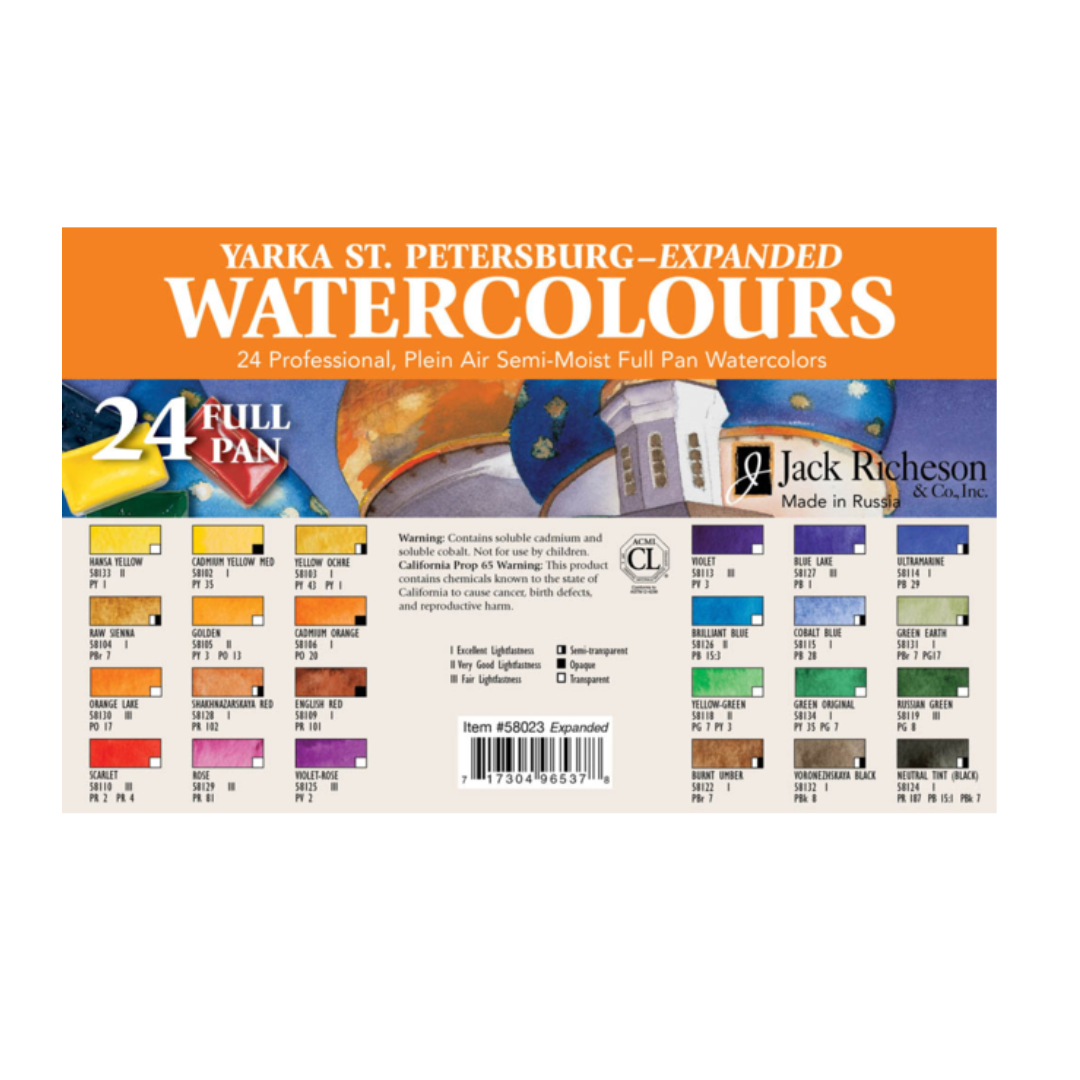 Experience a wider range of professional-quality watercolours with this expanded 24-pan set from the renowned St. Petersburg factory, known for over 100 years of excellence. Each full pan (3cc) is liquid-poured, ensuring vivid, long-lasting pigments with smooth application, ideal for artists seeking variety and depth in their work.