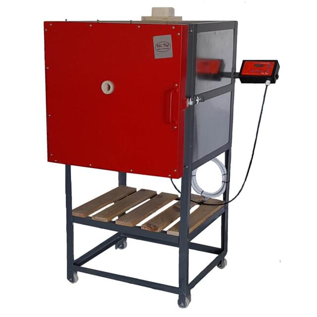 Mid-sized front-loading kiln with a durable steel frame and high-quality insulation for reliable and precise firing. Features a VT-36 programmable controller, K-Type thermocouple, and Kanthal wire elements, reaching up to 1300°C. Powder-coated steel ensures corrosion resistance, with a chimney for moisture release and an arched roof to improve heat circulation. Internal dimensions: 430mm (H) x 400mm (W) x 440mm (D). Operates on 25 amp, single-phase power, and includes wheels for mobility—ideal for versatile pottery projects.